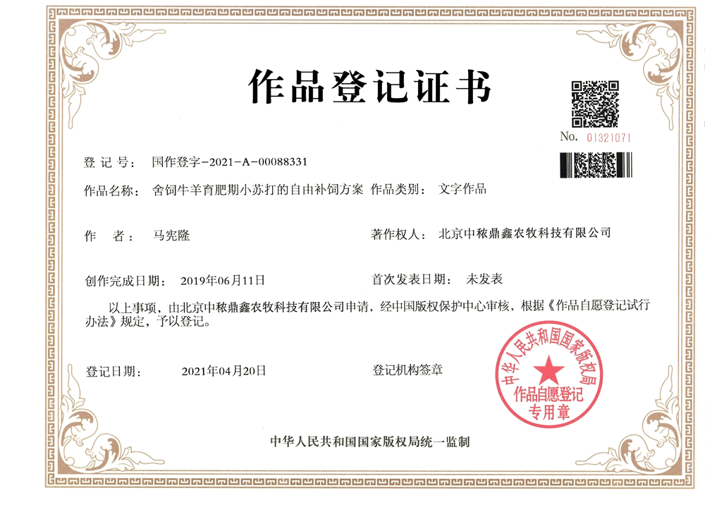 肉羊精準營養版權登記證書
