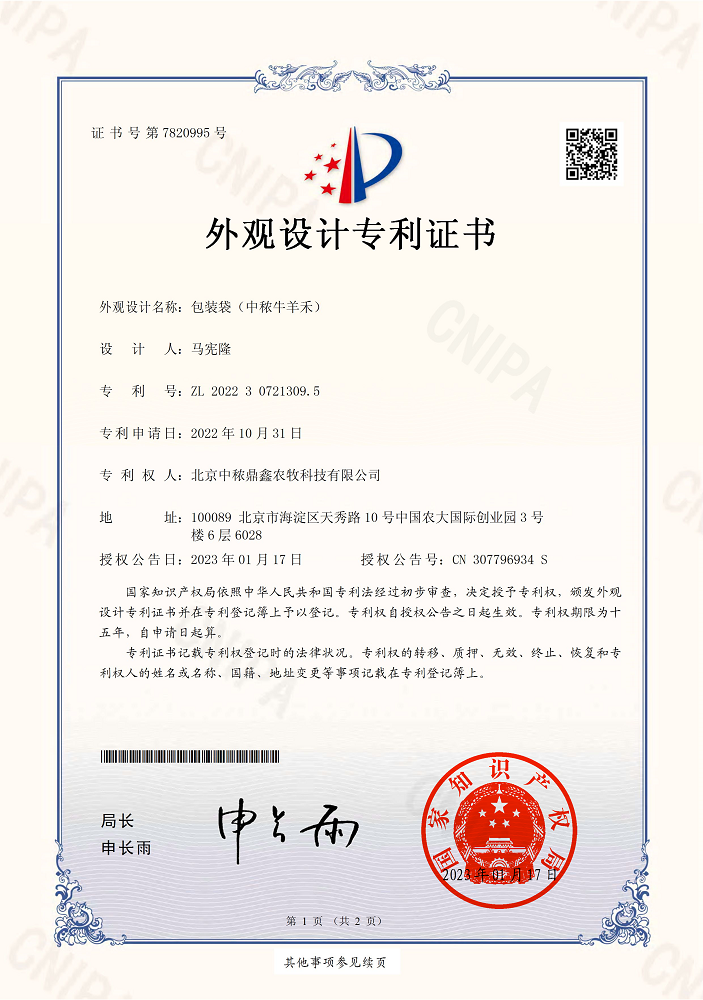 中秾牛羊禾外觀設計專利證書